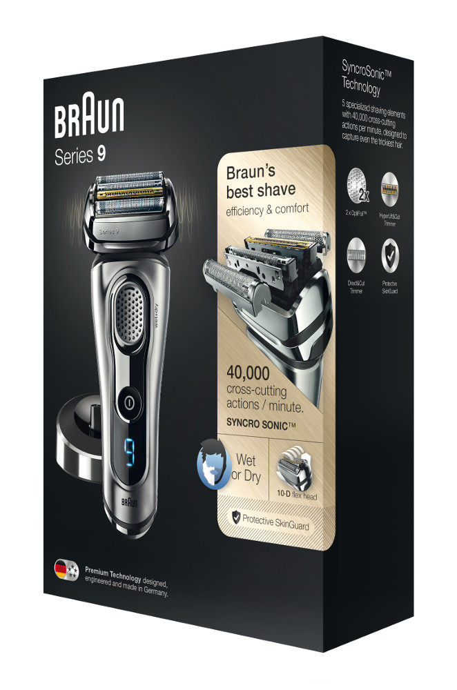 Der Braun Series 9 ist ein optimaler elektrischer Rasierer von Braun mit 5 synchronisierten Rasiererelementen, der weltweit stärksten Sonic-Technologie und einem intelligenten AutoSensing-Motor, der in einem Zug mehr Haare entfernt als jeder andere Rasierer. Ein 100 % wasserdichter Rasierer mit einer Lebensdauer von bis zu 7 Jahren, und ein mit Titanbeschichtung verstärkter Trimmer. Das perfekte Geschenk für ihn.